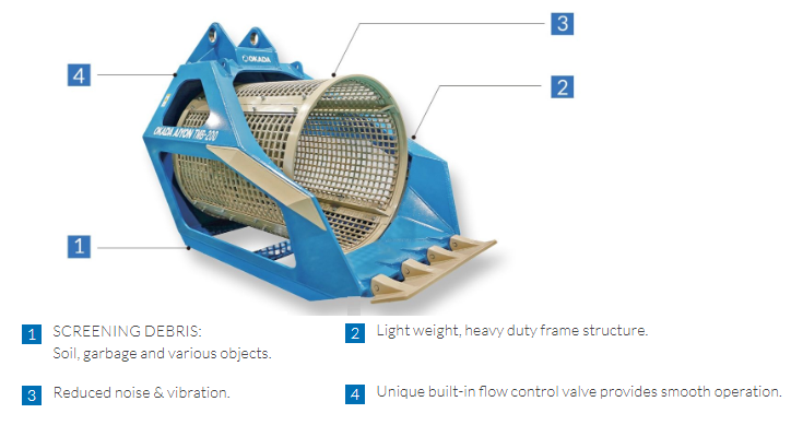 The compact design and tough frame structure of the Okada trommel bucket (TMB) make this attachment lightweight and easy to operate. A built-in control valve regulates flow and pressure to the TMB, eliminating the need for costly plumbing on the carrier excavator. A double-acting single pump flow kit used to run a thumb, crusher or shear is all that is needed to achieve two-way rotation. The in-body control valves allow the drum rotation speed to be fine-tuned for smooth operation in a variety of application.